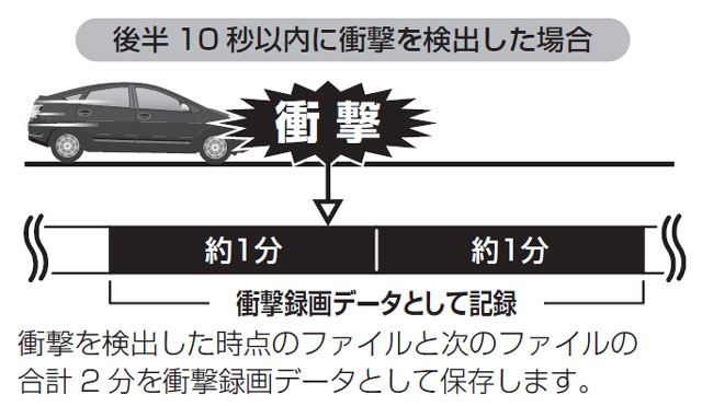 衝撃を検出した場合、自動的に、衝撃録画データとして記録されます。